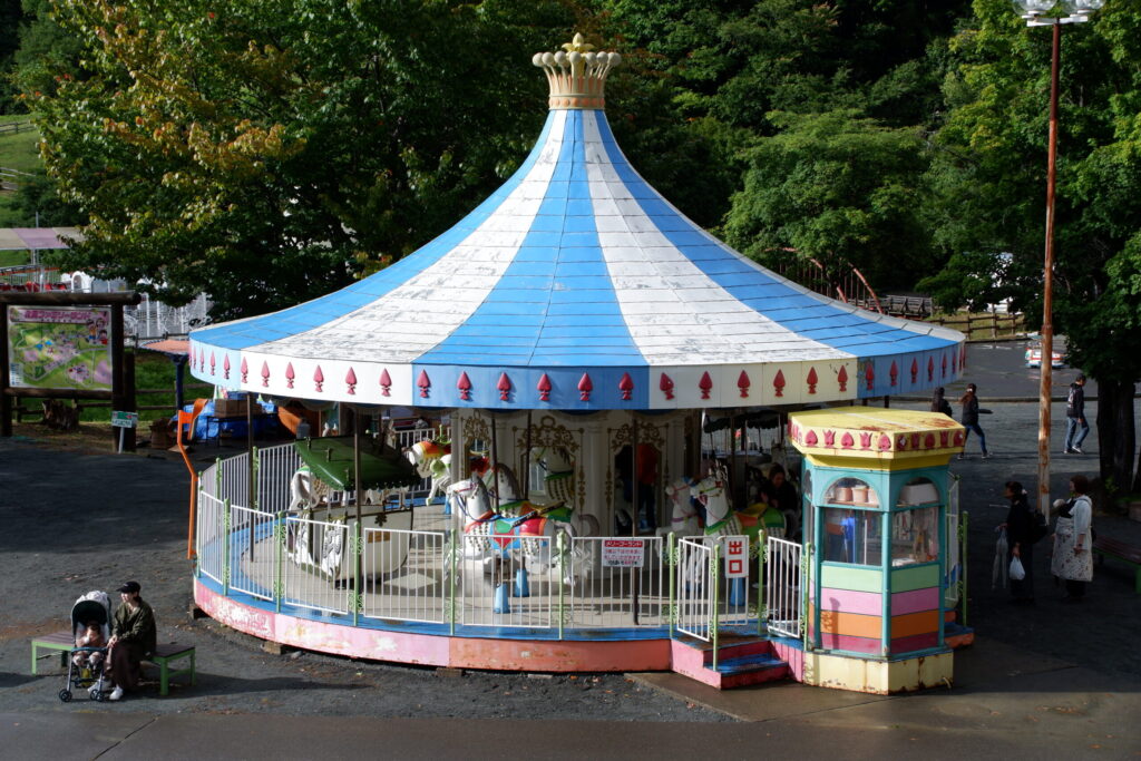 価格も待ち時間も文句なしのきたみファミリーランドですが、一番の魅力は園全体のレトロさ。わざわざこちらに出張することに決めた理由でもあります。見てくださいこのメリーゴーランド。プレーンベーグルのような味わいです。