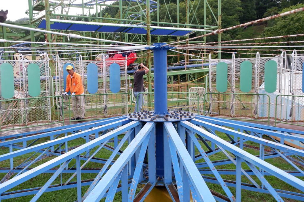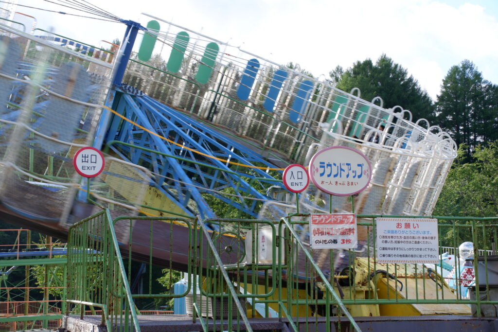 「ラウンドアップ」を遠くから見ると、恐ろしさが伝わるかもしれません。この角度で猛回転するのです。きたみファミリーランドを舐めてはいけない。初回の乗車を終えた人はほぼ強烈な回転性めまいに見舞われます。